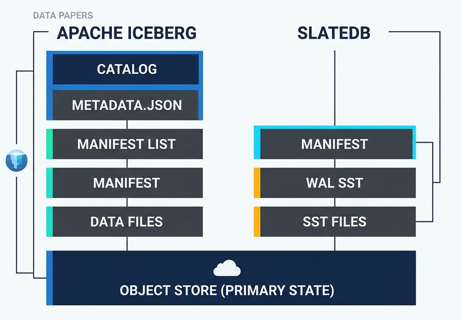 The post covered iceberg and Slatedb, and described how they use object store for tracking state of the table for basic operations. The high level design approach is very similar in all these formats, they use immutable files, predictable file names and compare&swap.