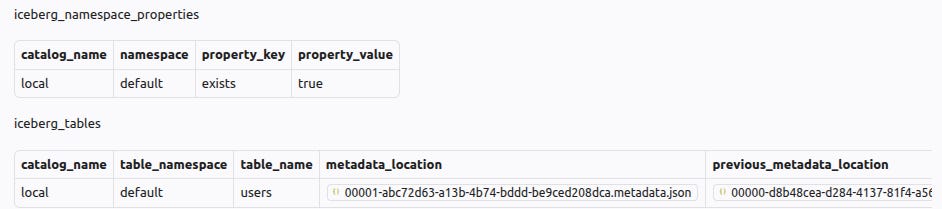 Iceberg also needs a catalog. Catalog stores the current metadata.json file for every table. Here is how the catalog would look for the example table. metadata_location would be updated on every update to the table.